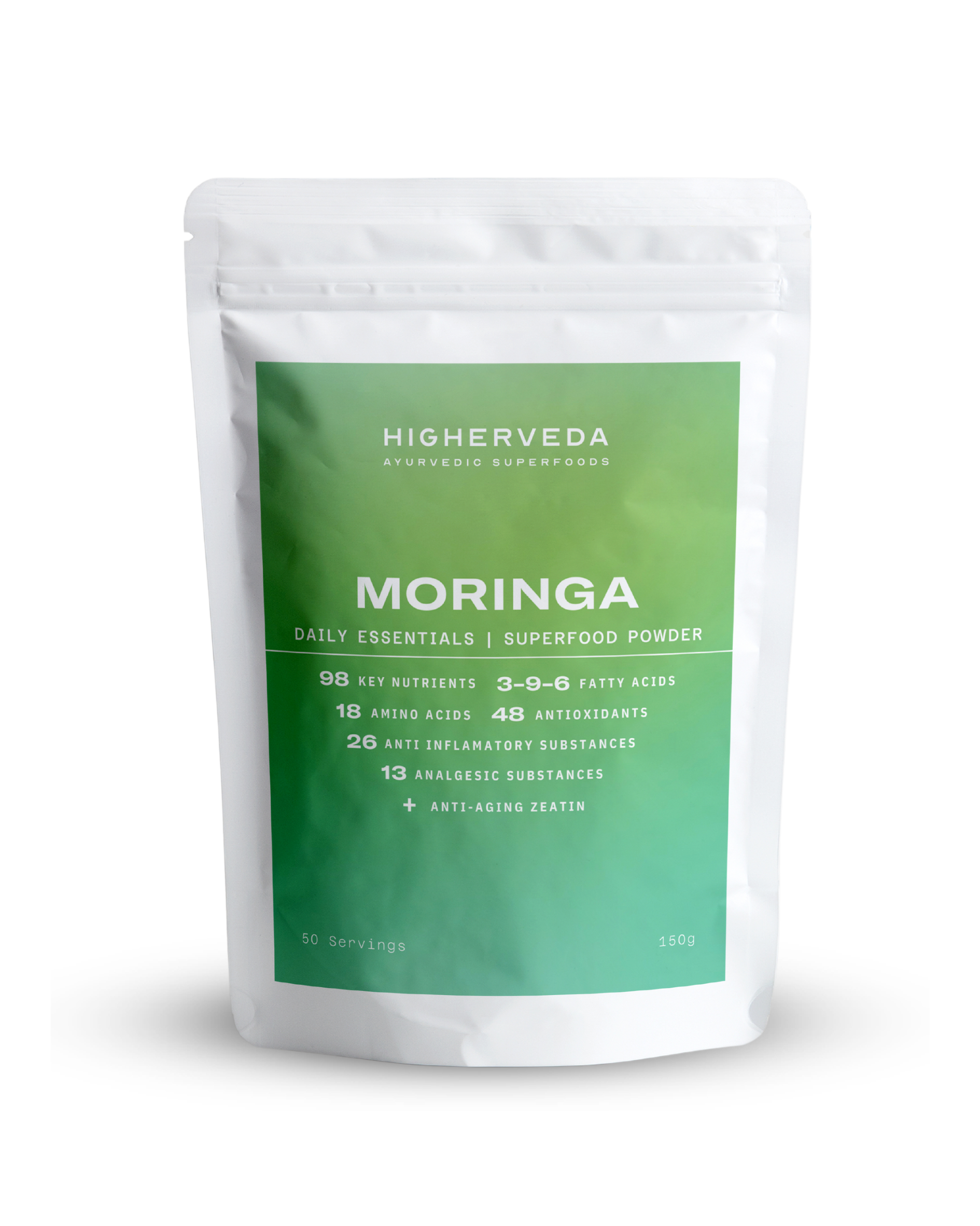 Smooth greens from moringa, cozy spice from Royal Brew, and a balanced herbal profile from Veda Vital. Pairs well with mindful basics—hydration, movement, and sleep.