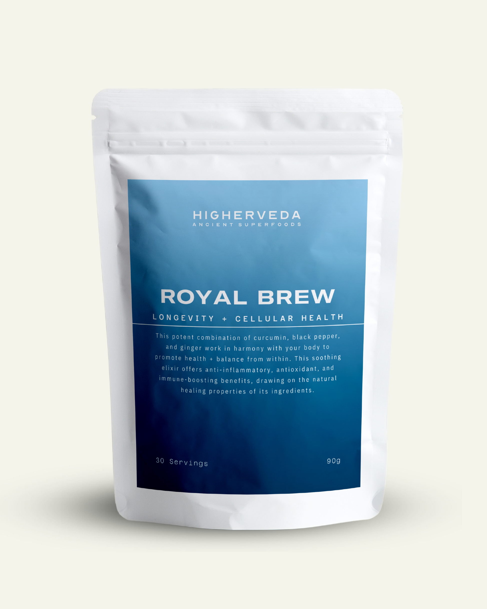 Royal Brew — a cozy golden sip starring turmeric (curcumin), black pepper, and ginger for a warm, spiced latte or tea. Comforting, aromatic, and caffeine-free.