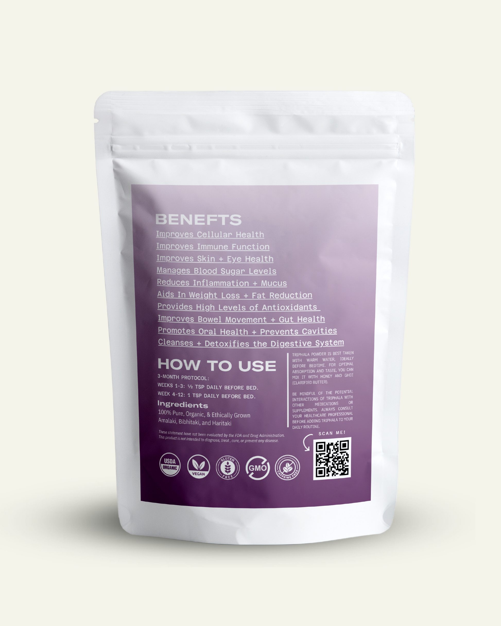 Triphala powder is best taken with warm water, ideally before bedtime. For optimal absorption and taste, you can mix it with honey and ghee (clarified butter).